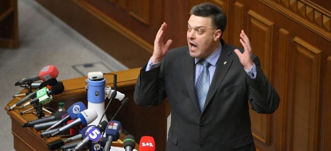 «Зачем вы создавали Национальную гвардию? Куда вы потратили 7 млрд. гривен? Почему СНБО до сих пор не закрыло границы с Россией, откуда постоянно прибывают сепаратисты и агрессоры?», — вопрошал с трибуны Тягнибок.